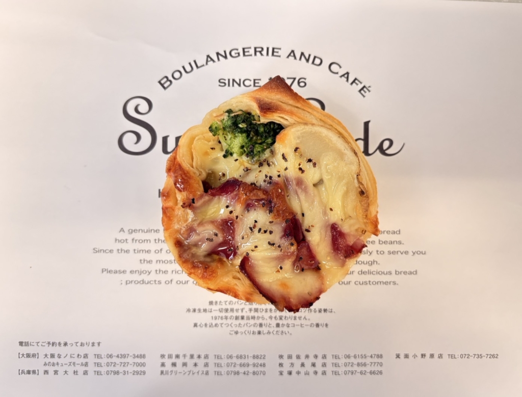 デニッシュ生地に赤ワインのビーフシチュー、牛タン、ポテト、ブロッコリーを乗せて焼き上げました。