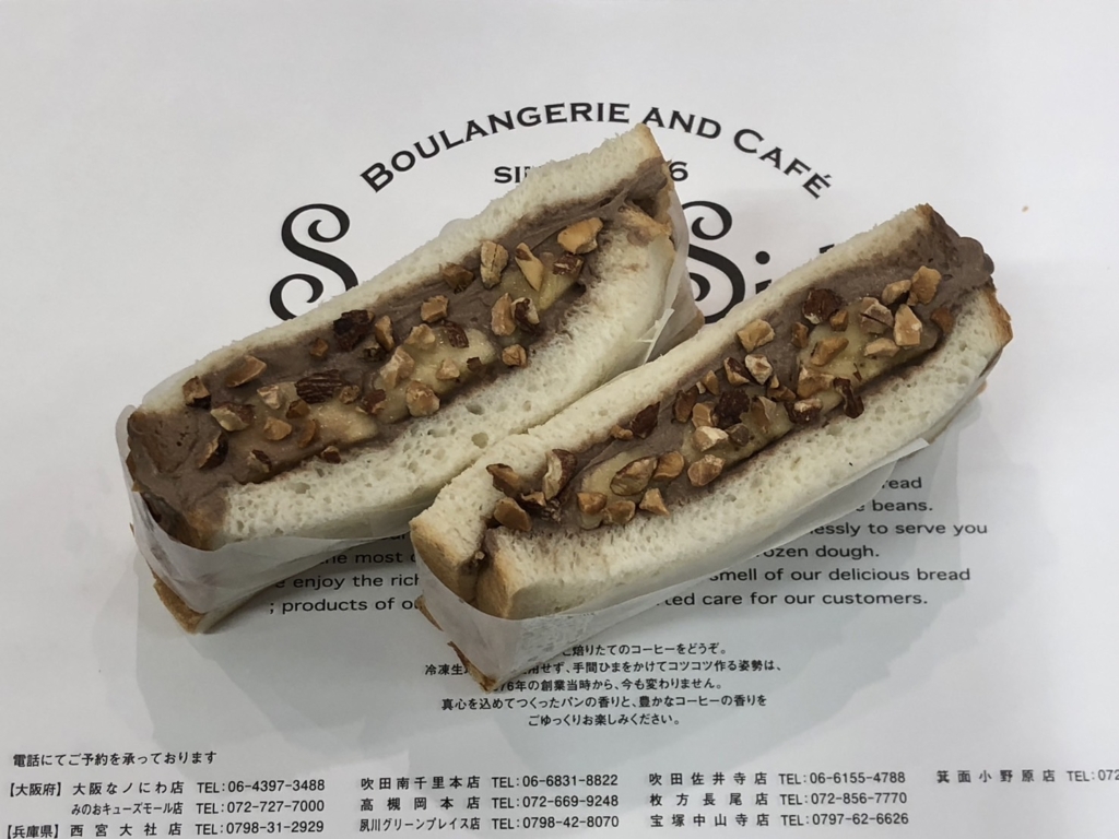 ヘーゼルナッツショコラと生クリームを合わせて、バナナとサンドし焼いたアーモンドをトッピングしました。