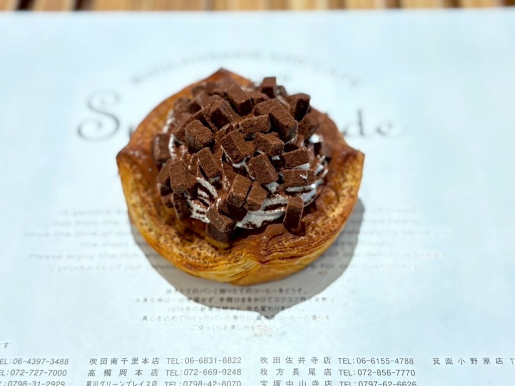 サクサクのクロワッサン生地にサクッと食感の焼きチョコを絞り焼き上げ、オレンジダイス、ホイップ、生チョコチャンクをのせ、ココアをかけて仕上げました。