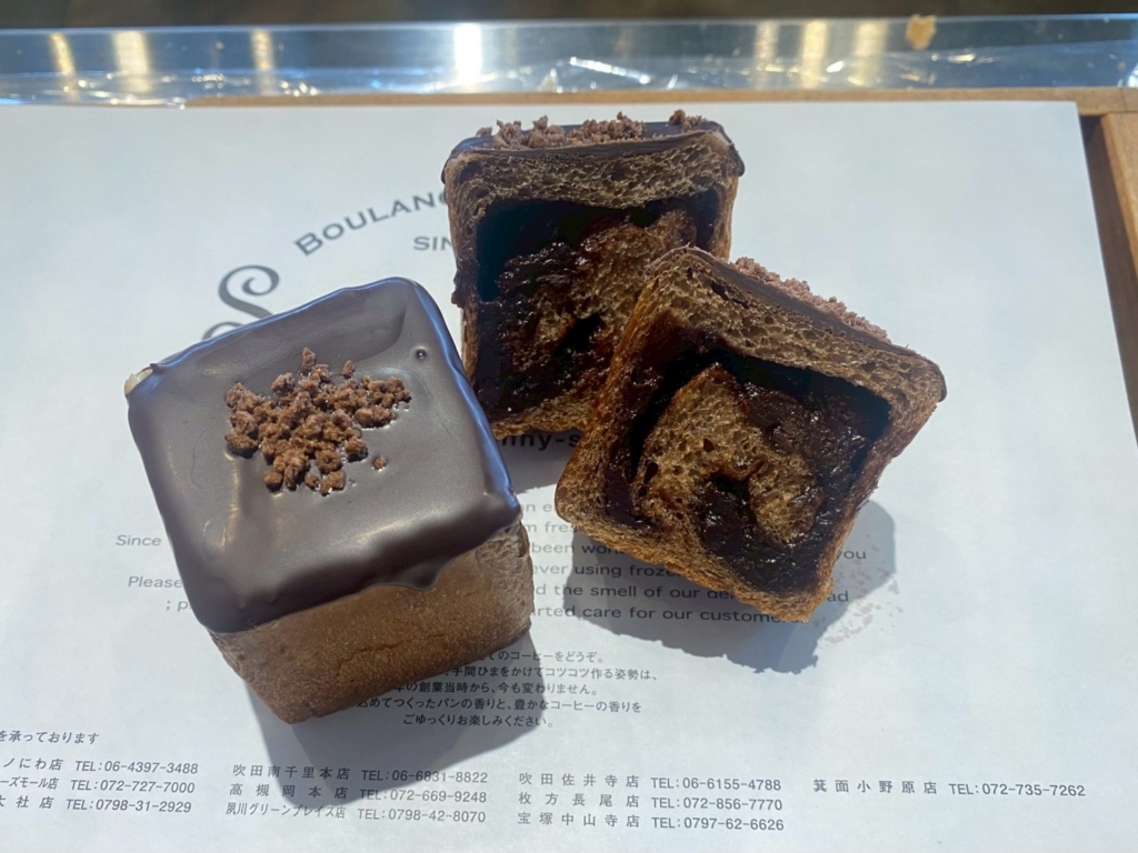 ココアを練り込んだ生地で生チョコ、チョコチップを巻き、キューブ型に入れ焼き上げました。上にチョコをかけて、チョコクランチをトッピングしてチョコづくしのパンに仕上げています。