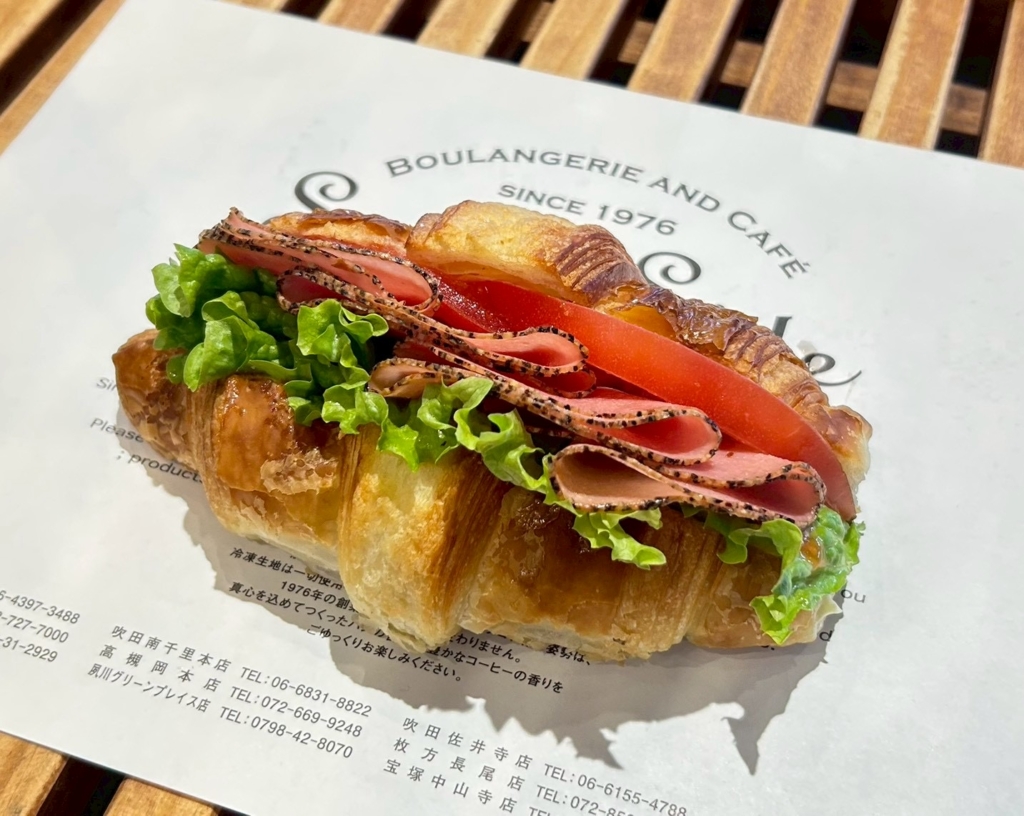 クロワッサンにマヨネーズをぬり、グリーンリーフ、ペッパーハム、トマトをサンドしました。