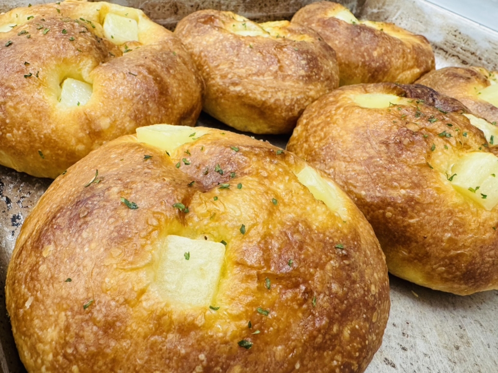 フォカッチャ生地にチーズをたっぷり包み込み、表面にじゃがいもダイス、塩を乗せて焼き上げました。オリーブオイルの香りが豊かな、ふんわり食感になってます。 iso
