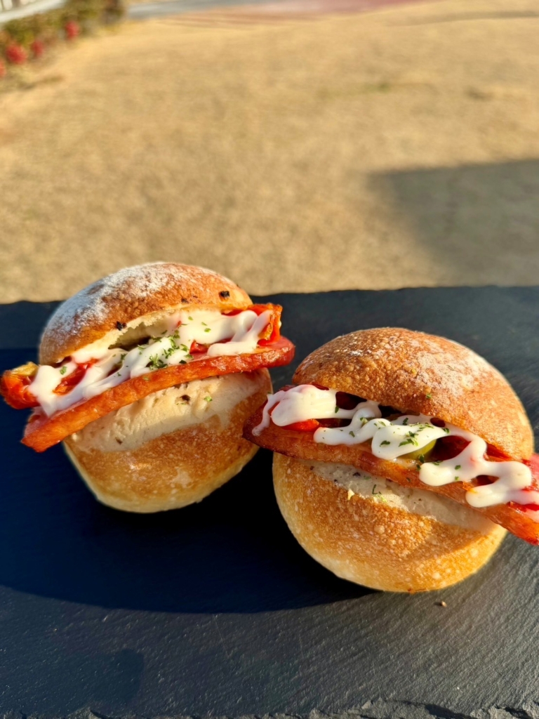 自家製チャバタにアンチョビソース入りマッシュポテトとベーコン、ドライトマト、ハラペーニョをサンドしました。