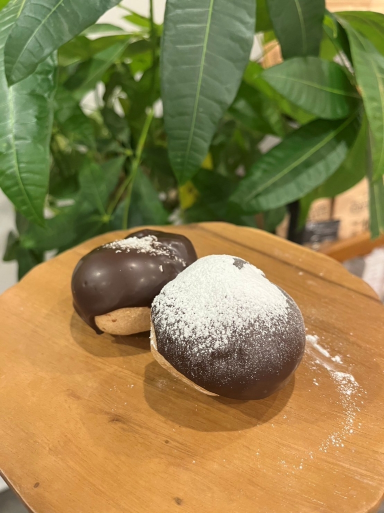 チョコを練り込んだ生地を使い、サクッとチョコ入りにはココナッツ、ブラッドオレンジのマーマレード入りには粉糖をかけた、2種類のチョココーティングもっちーです。