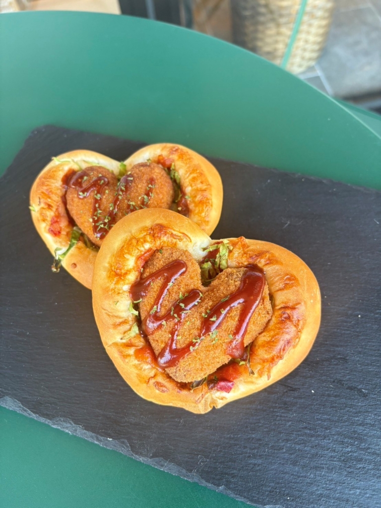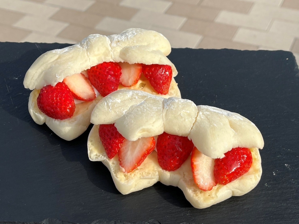 食パン生地をリボン型に成形し、中に自家製カスタード、ホイップクリームを絞りフレッシュな苺を贅沢にトッピングしました。