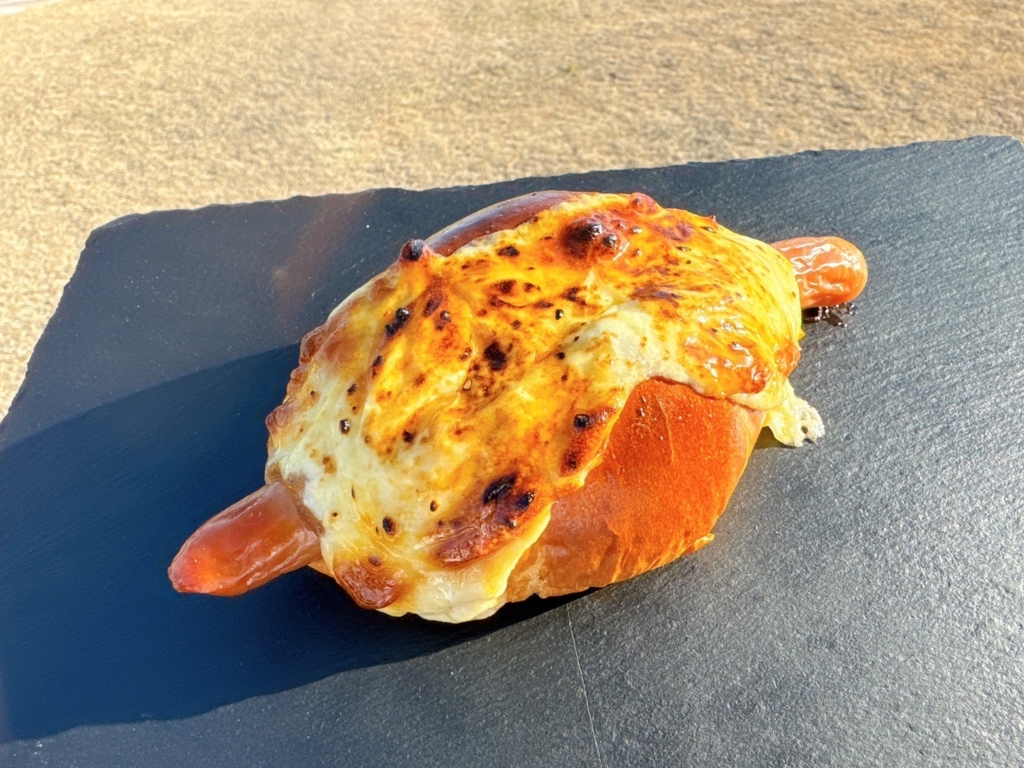 テーブルロールにバジルペーストを塗りウインナーと相性抜群のオニオンソース、特製チーズソースをこんがり焼き上げました。