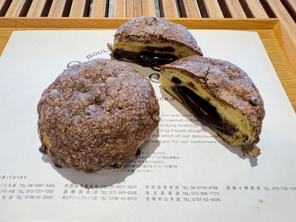 当店人気のメロンパンにたっぷりのチョコチップと生チョコを包んで、メロン皮にはココアを練り込みました。