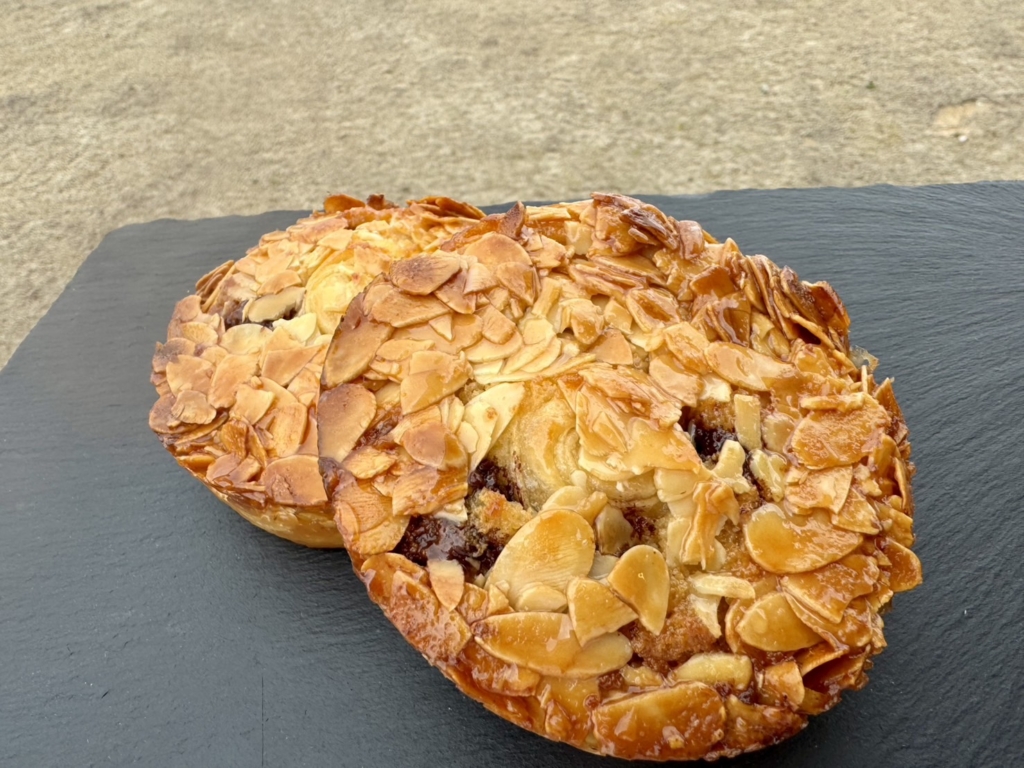 クロワッサン生地にアーモンドクリームとチョコチップを巻き込み、フロランタンを乗せて焼き上げました。