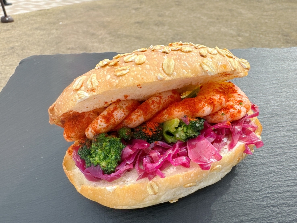オーツ麦をつけたチャバタに紫キャベツとビーツのラぺ、スイートチリを和えた海老とブロッコリーをサンドしました。
