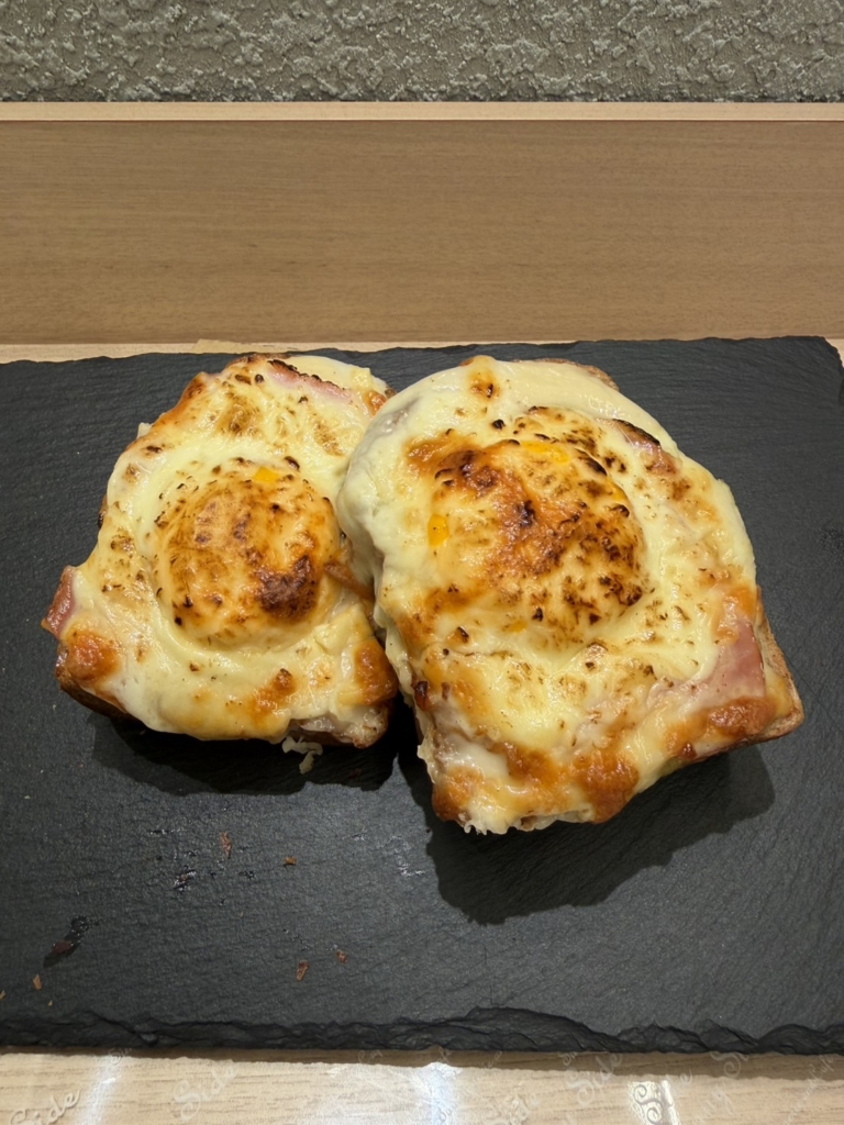 焙煎ライ麦全粒粉入りの食パンにホワイトソース、ハム、卵、チーズをのせて焼き上げました。