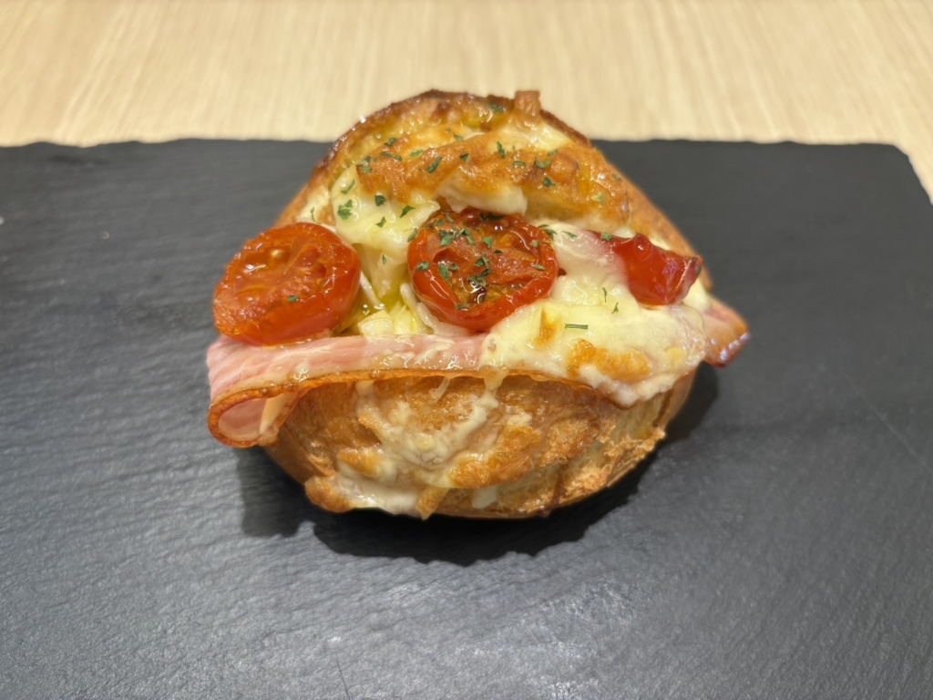 緋色に染まるトマトと旨みたっぷりのツナとベーコンを挟み仕上げました。