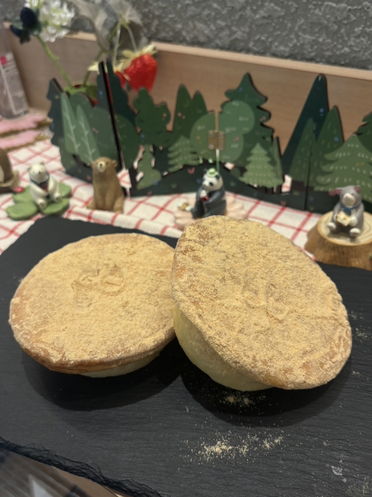 よもぎ生地にうぐいす豆とこしあんをたっぷり包み焼き上げました。