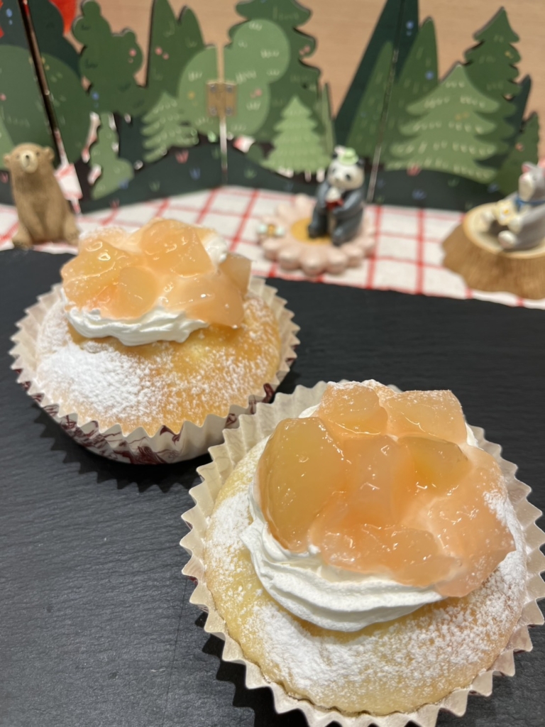 スイート生地に白桃と白桃ジャムをつつみホイップクリームの上にも白桃を乗せました