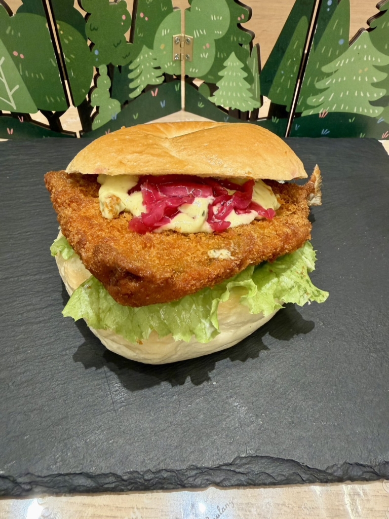 アジフライにアボカドを使ったタルタルソース、紫キャベツのラぺをのせてベーグルでサンドしました。