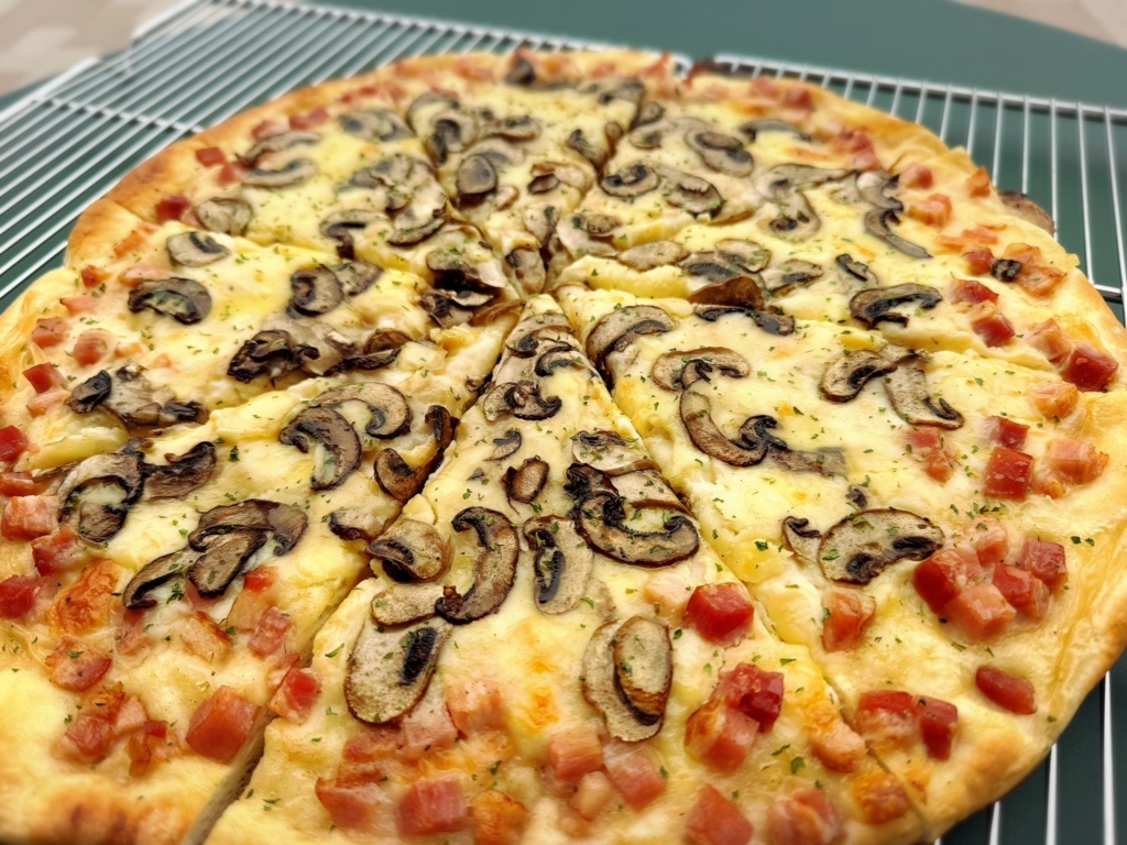 ライ麦香る生地にホワイトソース、マッシュルーム、ベーコンをしっかりのせ焼き上げました。